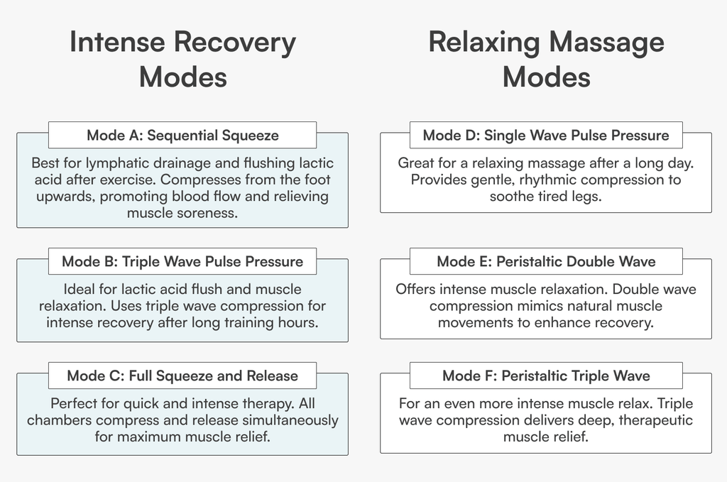 - Best for lymphatic drainage and flushing lactic acid after exercise. Compresses from the foot upwards, promoting blood flow and relieving muscle soreness.